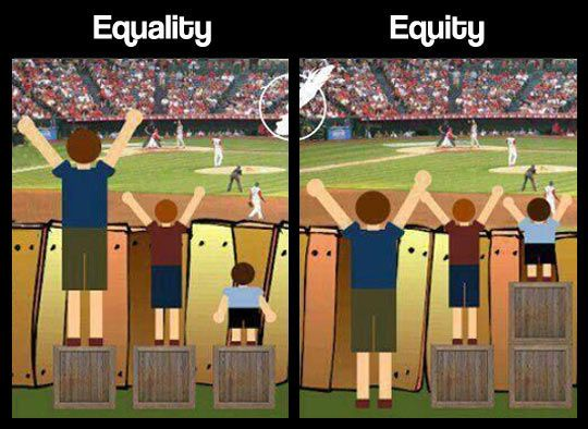 Equality is when everyone has the same resources, opportunities and obstacles. Equity happens when each person has what they need to achieve a desired outcome. Equal opportunity is the law, but equity is what leads to optimal outcomes of unity and productivity. The most popular representations of equity versus equality were inspired by Craig Froehle’s illustration of children looking over a fence.